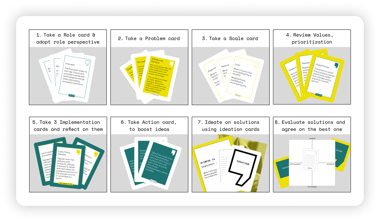 Problem cards present democracy-related challenges based on the Democracy Labs workshops run during the INCITE-DEM project and public trials of design-fiction stories.