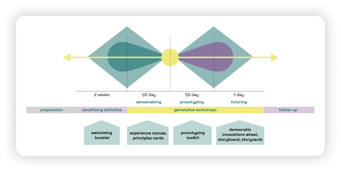 The toolkit combines individual pre-work and collaborative workshop activities. The diagram shows a typical sequence and timing of the key activities, along with the materials used within them. The flow is suggested, not fixed.