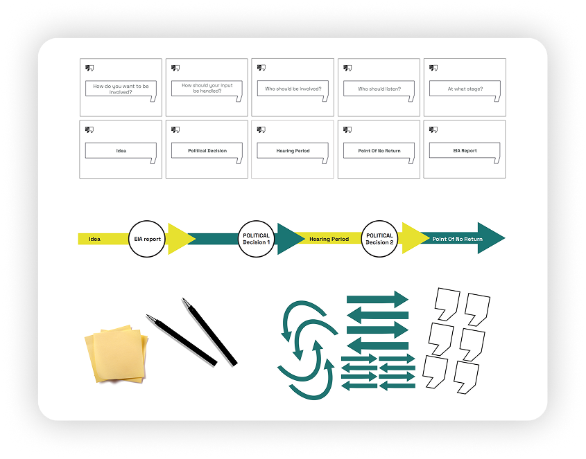 Participants use the timeline template and the provotyping cards to reconstruct the decision-making process and discuss who is involved, who is heard, and who decides at different points. Participants then redesign the timeline to propose a more open, transparent, and citizen-inclusive alternative, and groups share their redesigned timelines when several tables work in parallel. Stickers can be used to support visual mapping.