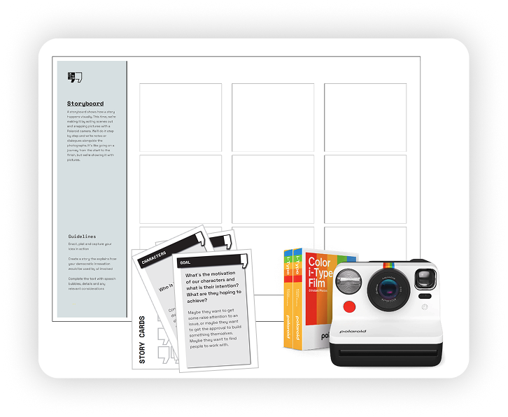 A template for turning a democratic innovation idea into a short, step by step scenario showing how citizens would engage with it in a real life situation. Storycards can be used as prompts.