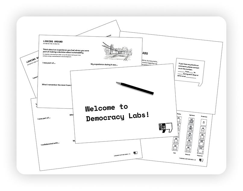 Participants complete the Welcoming booklet as an individual sensitising activity. The booklet includes guided reflection activities that help participants revisit past and recent experiences of democratic participation and engagement, including moments of feeling empowered or disenfranchised in decision-making that affects their lives. Participants bring the completed booklet to the workshop session and use it as input for the discussion.